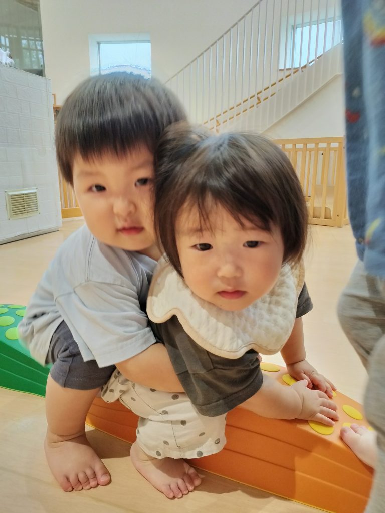 こちらはウェーブバランスの上に座っているところに、後ろからお友達がぎゅーっ!