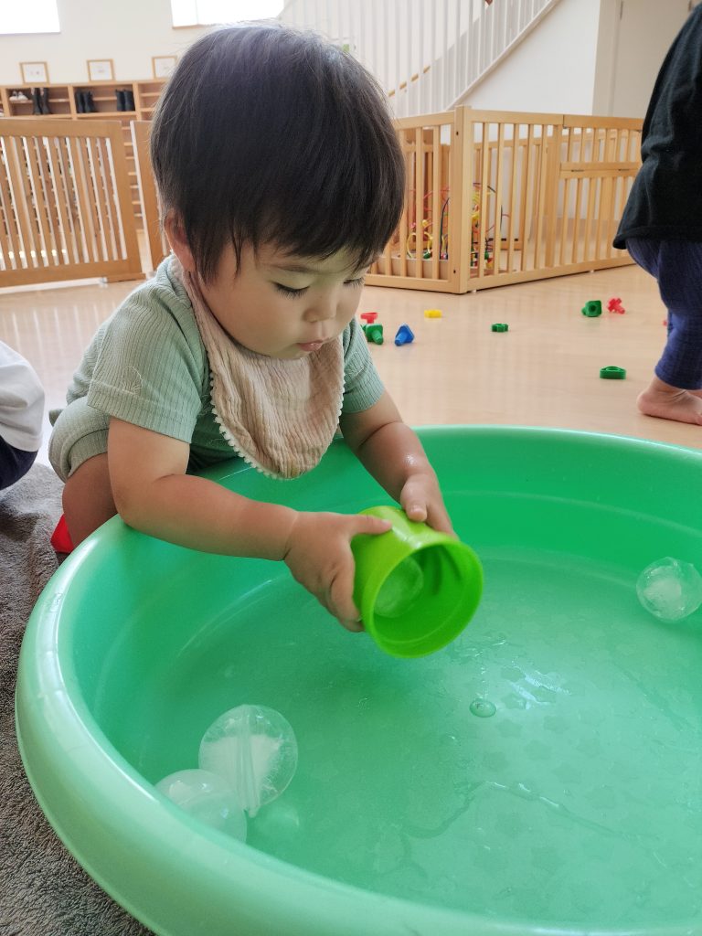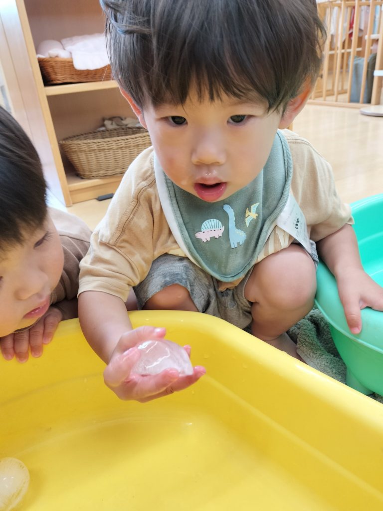 こちらのお友だちは氷をコップに入れて、たらいに移し替えていました!