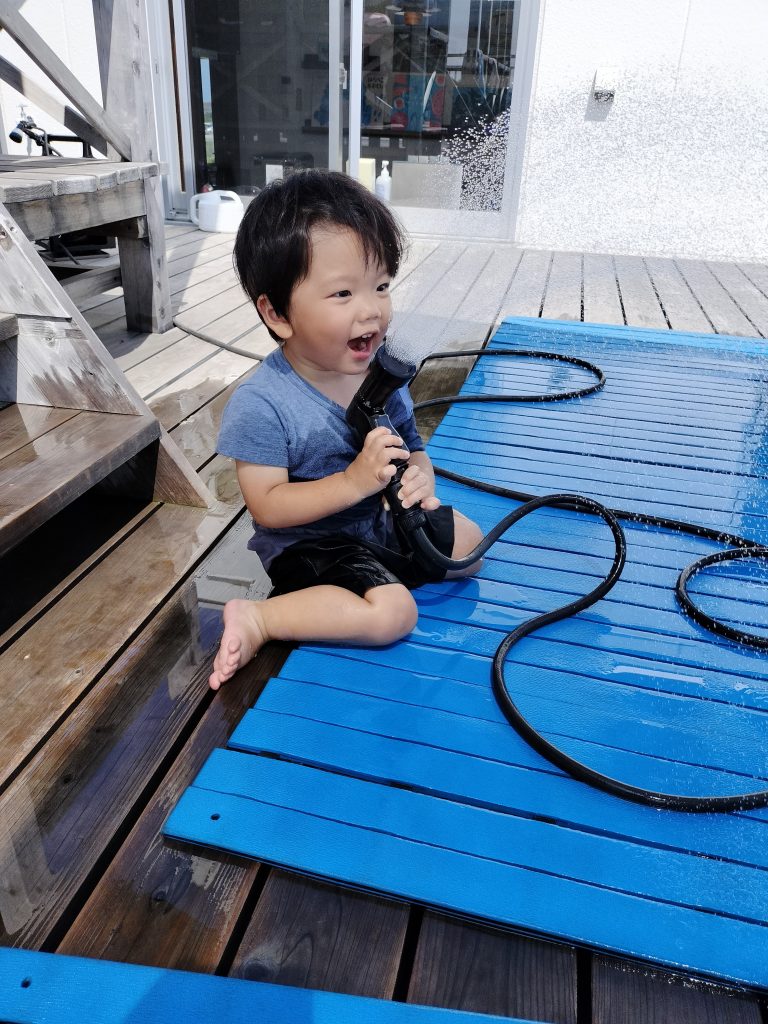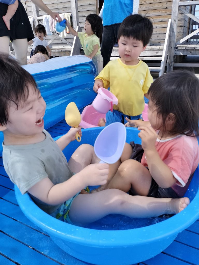 こちらのお友だちはタライに入りながらバケツに水を汲んでいました!