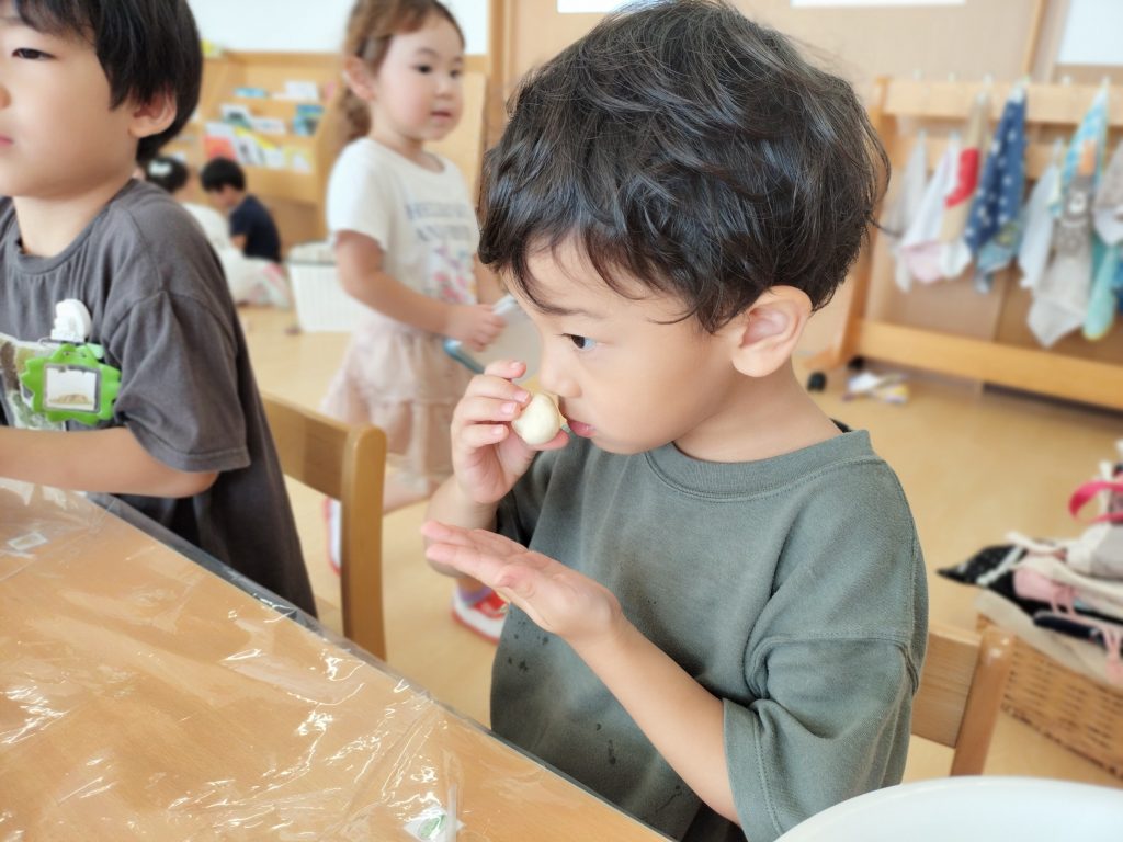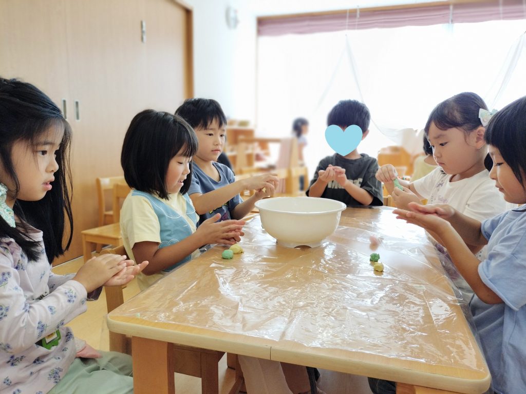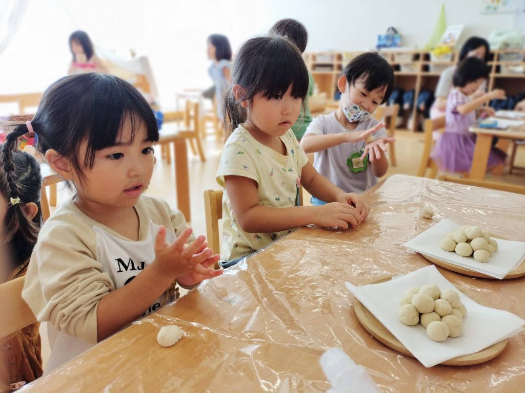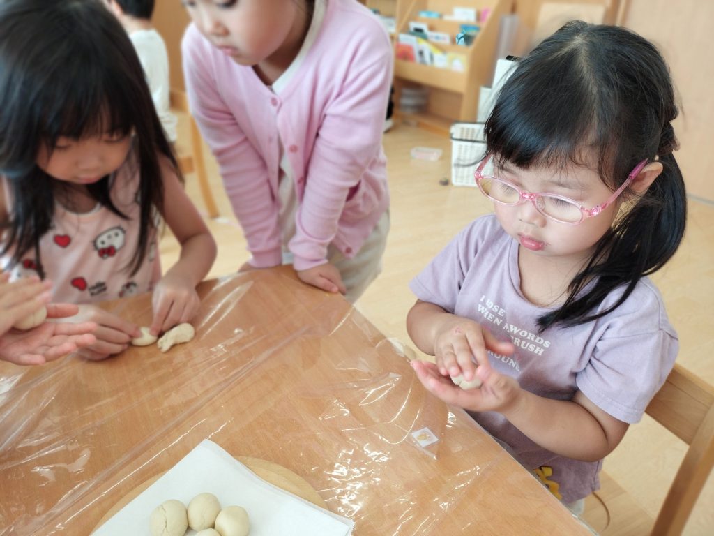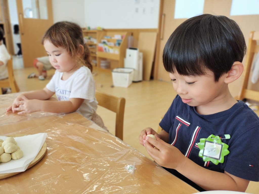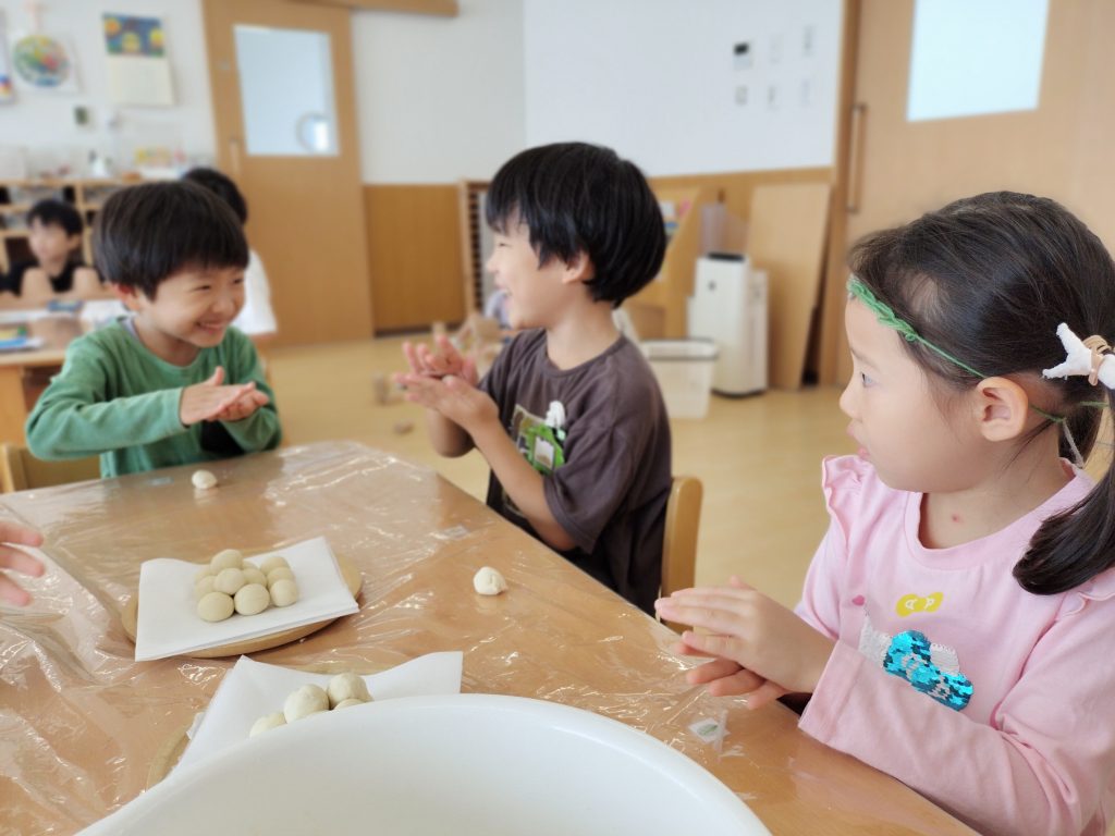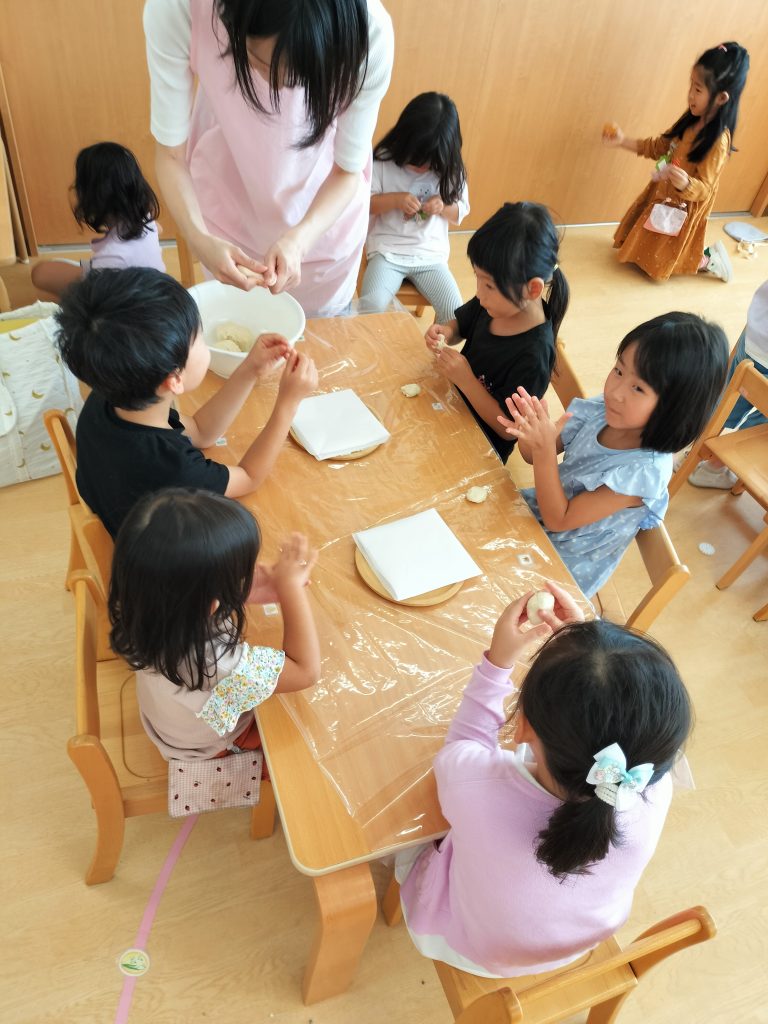 十五夜当日の昨日、2組では小麦粉粘土で子どもたちとお月見団子づくりを楽しみました!
