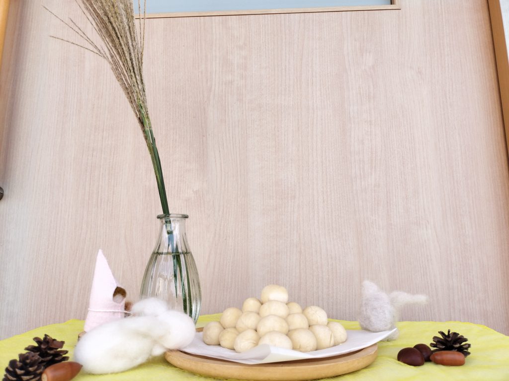 完成したお月見団子は、みんなで園舎横に取りに行ったススキと一緒に季節のテーブルに飾りました🎑