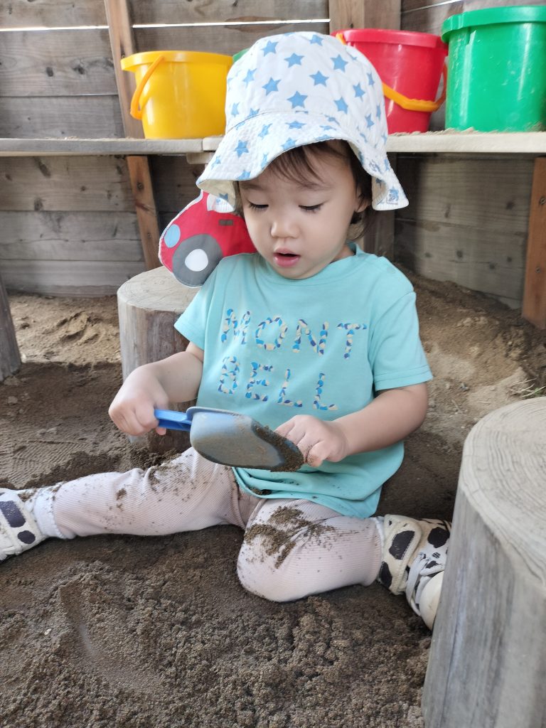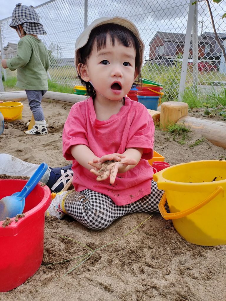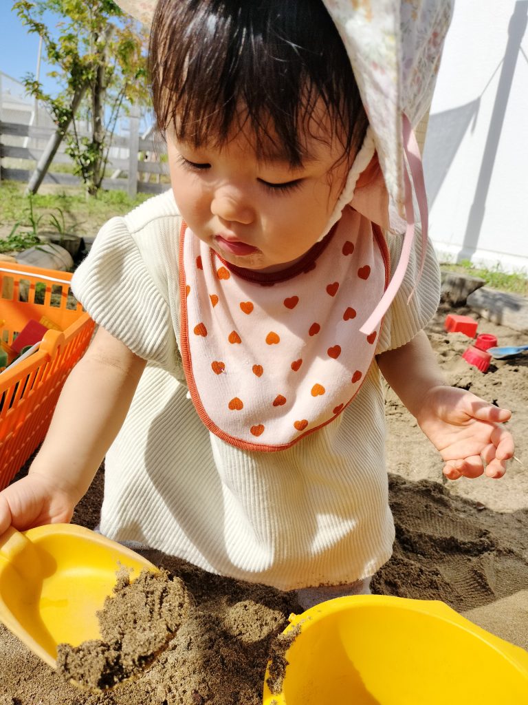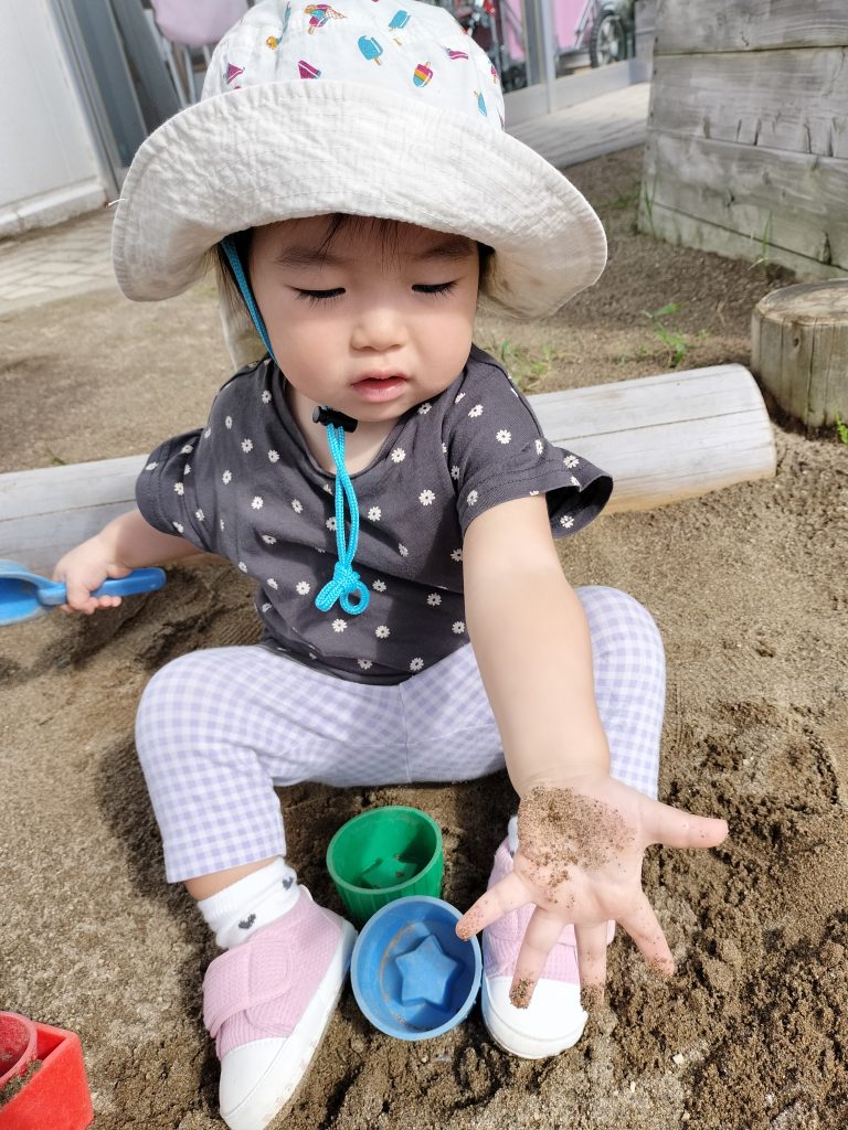 初めて砂遊びをした時には、手についた砂を気にして、保育者に手を見せる姿も見られていました🤲