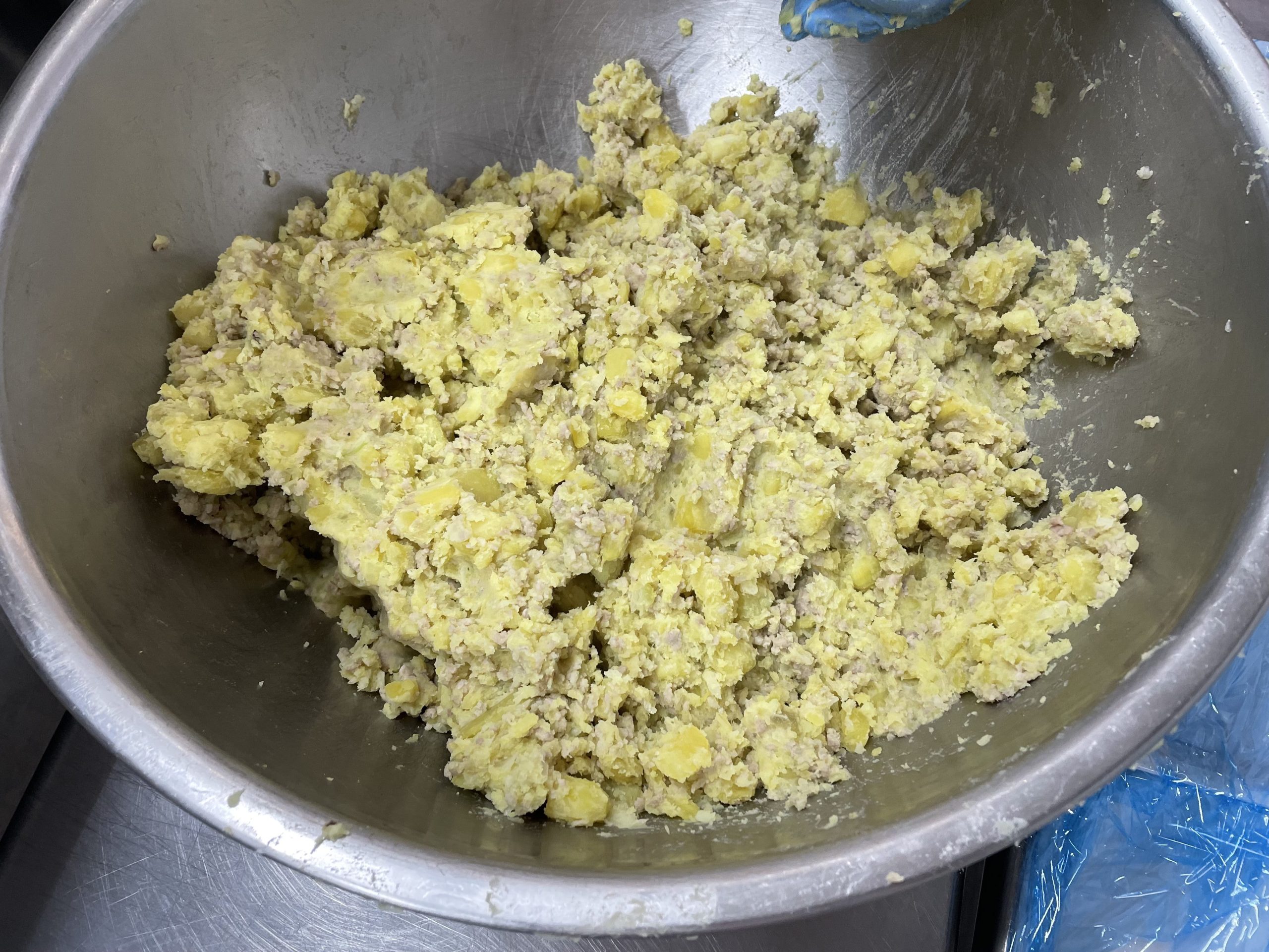 皮を剥いて、茹でたさつまいもは潰していきます。