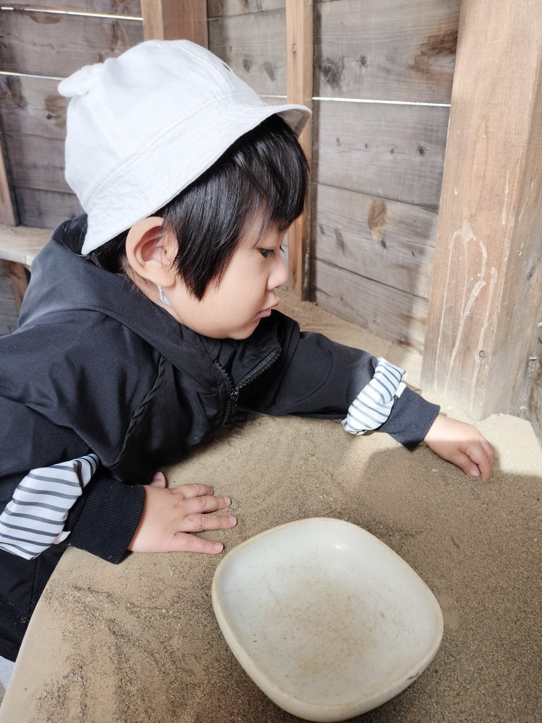 砂遊び用のカップをたくさん集めて重ねるのを楽しんでいました😀