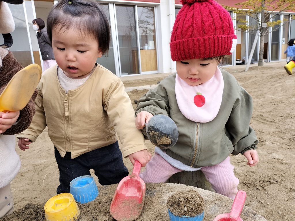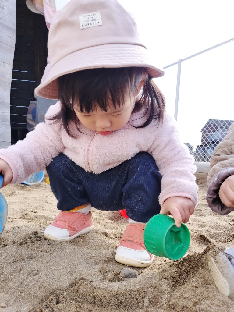 カップやバケツに砂を入れたり、移し変えたりしています!
