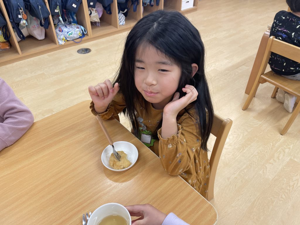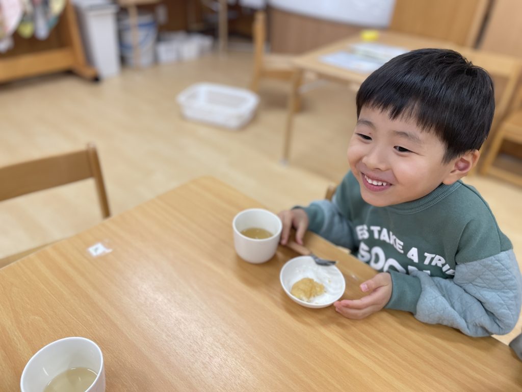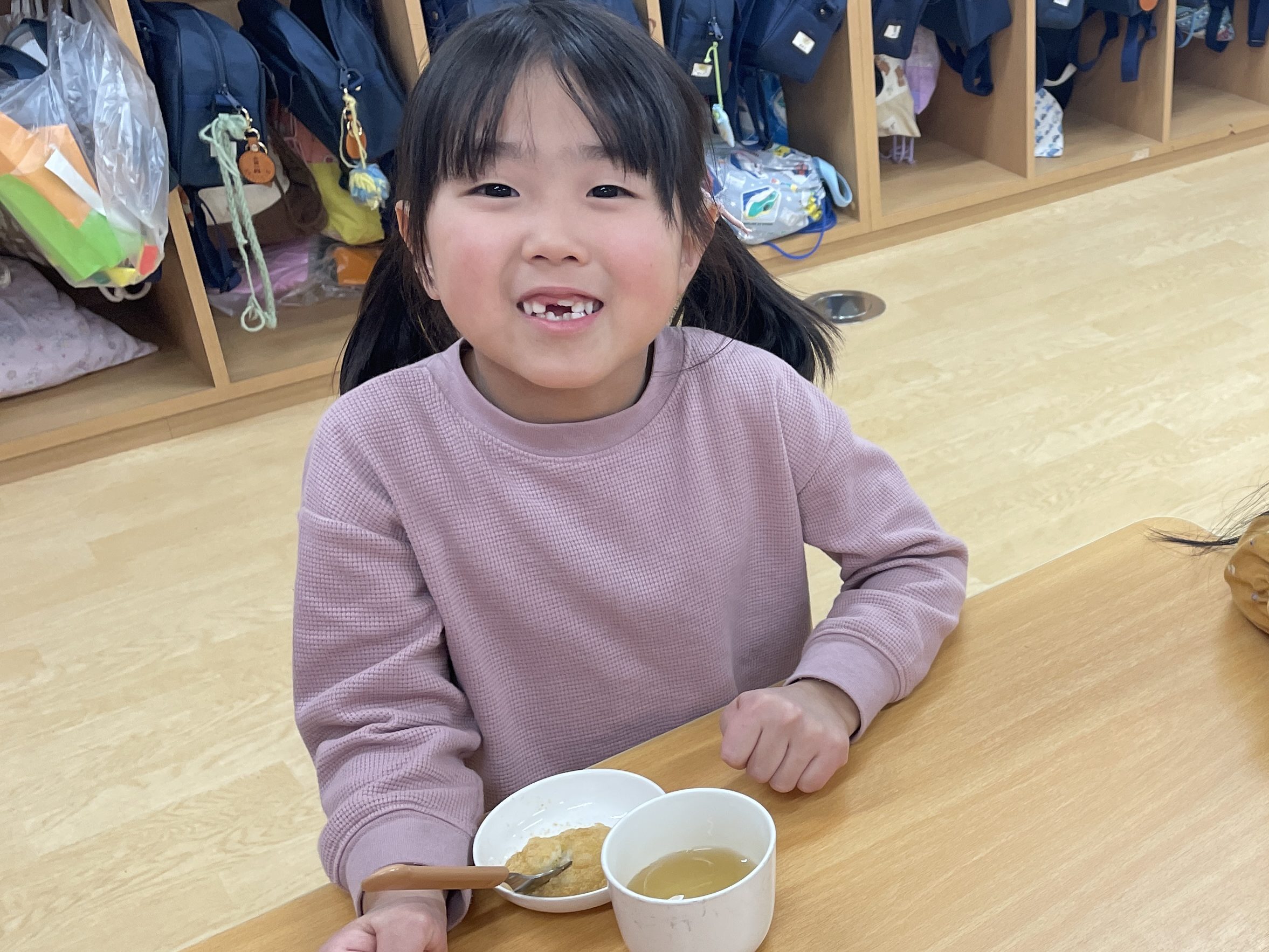 今日は、2月3日「節分の日」なので、おやつに【きびだんご】が登場しました🍡
